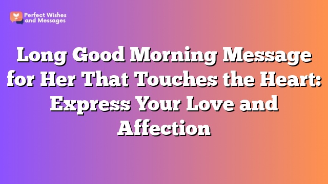 Here’s an example of a long good morning message for her that touches the heart: “Good morning, my love. I just wanted to take a moment to remind you how special you are to me. Your smile brightens my day, your laughter is music to my ears, and your love fills my heart with warmth. I am so grateful to have you in my life, and I cherish every moment that we spend together. I hope today brings you as much joy and happiness as you bring to me every single day.”